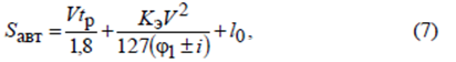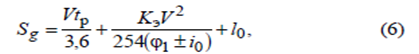 где V – расчетная скорость, км/ч; tр – время реакции водителя, принимаемое в расчетах равным 1 с; Kэ – коэффициент эксплуатационных условий торможения, для легковых автомобилей равен 1,2; для грузовых автомобилей и автобусов – 1,3–1,4;