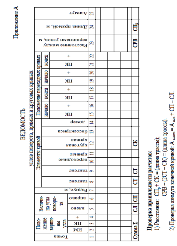 – ведомости углов поворота, прямых и круговых кривых (приложение А);