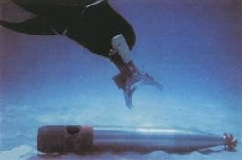 В первом случае для уничтожения мин применяется подрывной заряд Mk.98, который состоит из механического захвата нажимного действия, соединенного тросом с поплавковой сборкой (фото 5б). Поплавковая сборка длиной около 70 сантиметров имеет двухсекционную конструкцию. В якорном отсеке, обладающем отрицательной плавучестью, размещен заряд высокоэнергетического взрывчатого вещества и блок электронной аппаратуры исполнительных устройств, включающих дистанционный взрыватель и устройство замедления. При помощи чеки со специальной контрольной пластиной, выступающей из корпуса, якорный отсек механически соединен с плавучим отсеком-буем, придающим всей конструкции общую положительную плавучесть.