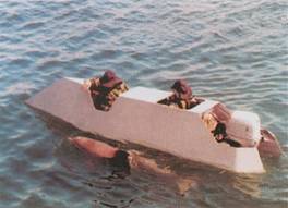 Фото 3. Двое военнослужащих подразделения СпН на моторной лодке типа «каяк» в сопровождении дрессированного дельфина в ходе проведения скрытной операции | Фото 4. На бортах лодки с инструкторами отчетливо видны два белых круга, касаясь которых дельфин сигнализирует об обнаружении мины или подводного диверсанта |