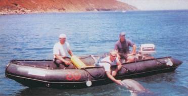 Для проведения противоминных действий дельфины с корабля-носителя доставляются в район поиска внутри специальных надувных садков с водой (так называемых "мокрых кроватей"), буксируемых быстроходным катером, либо на дне самого катера. Вместе с дельфином в назначенный район доставляется надувная лодка инструктора (фото 4), оснащенная приемником космической навигационной системы (КНС) GPS «Навстар», средствами радиосвязи и портативным автоматизированным рабочим местом (АРМ) оператора БТС, разработанным на базе переносного персонального компьютера. С прибытием в район поиска катер остается дрейфовать на безопасном расстоянии, дельфины выпускаются в свободное плавание, а дрессировщик, оставаясь в лодке, организует поисковые действия, управляя дельфинами при помощи жестов. После обследования заданного района дельфин сообщает о наличии или отсутствии миноподобных объектов посредством удара по веслу шлюпки с соответствующего борта. Для классификации обнаруженных объектов и контроля со стороны дрессировщика за действиями животных к грудному плавнику дельфина может крепиться малогабаритная видеокамера (фото 5а).