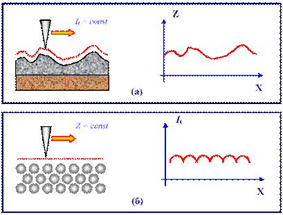 Реальный туннельный контакт в СТМ не является одномерным и имеет более сложную геометрию, однако основные черты туннелирования, а, именно, экспоненциальная зависимость тока от расстояния зонд-образец, сохраняются также и в более сложных моделях, что подтверждается экспериментально. Экспоненциальная зависимость туннельного тока от расстояния позволяет осуществлять регулирование расстояния между зондом и образцом в туннельном микроскопе с высокой точностью. Это используется в двух режимах СТМ: измерение изменения в положении острия (то есть расстояние до поверхности образца) при постоянном туннельном токе (используется чаще) (схема a) или измерение туннельного тока при поддерживании расстояние Z от острия до поверхности образца постоянным (схема б):
