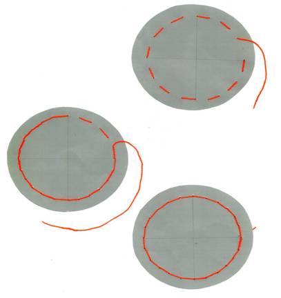 2. Смёточным швом проложить стежки по всей окружности до точки 1.