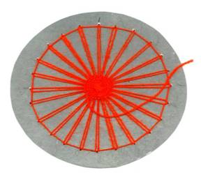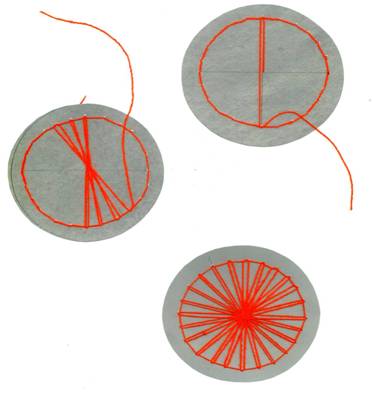 2. Провести её по радиусу на противоположную сторону окружности, продеть под один из стежков окружности и снова ввести в круг под стежки слева от первого. Работа продолжается до тех пор, пока не будет заполнен весь круг.