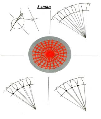 4. Закончив «паучок», кусочек недостающей для последнего радиуса нитки протянуть и перейти к другому ряду стежков.