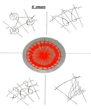 5) Далее чередовать этот приём в точке 3, 4 и т. д., продвигаясь против часовой стрелки. Получатся своеобразные восьмёрки – лучики, которые пересекутся в центре.