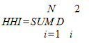 б) индекс рыночной концентрации Герфиндаля-Гиршмана (HHI) - сумма квадратов долей (выраженных в процентах) на товарном рынке всех хозяйствующих субъектов, действующих на данном рынке:
