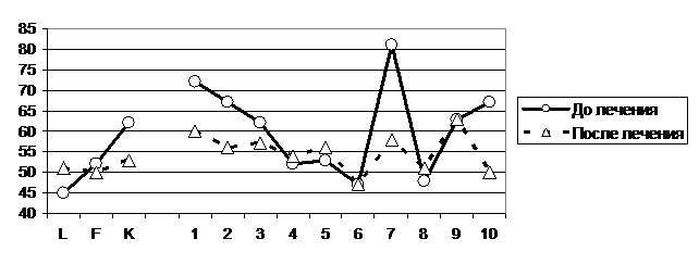 Восстановительное лечение благоприятно отразилось на психологическом статусе лиц, перенесших стрессорные расстройства в результате служебно-боевых действий. В результате изучения личностных характеристик испытуемых были выявлены три усредненных типа личностных профилей, которые изменились в результате нелекарственной коррекции этих состояний, что представлено на рис. 1-3.