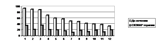 СКЭНАР терапия. СКЭНАР - (самоконтролирующий энерго-нейроадап-тивный модулятор) прибор, особенностями которого являются: форма сигнала (сигнал физиологический, хорошо возбуждающий нервные волокна) и наличие биологической обратной связи (изменения электрокожного импеданса управляют работой прибора), создающие систему лечения – «Организм-прибор». Сущностью этой системы является воздействие на адаптивные процессы организма с целью их гармонизации за счет быстрореагирующей информационной обратной связи, обеспечивающейся соответствующим прибором, разработанным в ОКБ «Ритм». Сеансы проводились через день, каждому пациенту было проведено 10-12 сеансов.
