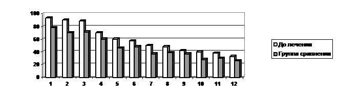 Рисунок 4. Динамика клинических проявлений постстрессорных расстройств при применении нелекарственных методов восстановительного лечения. 1. Повышенная истощаемость. 2. Снижение работоспособности. 3. Психосоматические проявления. 4. Раздражительность. 5. Снижение уровня естественных влечений. 6. Расстройства сна. 7. Реминисценции. 8. Метеолабильность. 9. Синестопатии. 10. Гипергидроз. 11. Повышенная настороженность. 12. Нарушение терморегуляции.