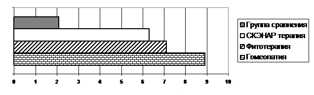 Как показано на рисунке 4, наиболее эффективным было лечение в группе, в которой проводилось гомеопатическое лечение. Эффективность лечения в группе контроля, в которой гомеопатия применялась в виде плацебо, была значительно ниже, этот факт позволяет предположить, что основным источником клинической эффективности в данном исследовании явился метод конституциональной гомеопатии. Применение фито - и СКЭНАР-терапии также было эффективным и достоверным относительно группы сравнения, однако выраженность изменений отмечалась в несколько меньшей степени.