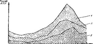 На рисунке 3.5 представлена другая разновидность графического изображения зависимостей, когда различные линии не пересекаются и имеют приблизительно одинаковую форму. Переменная, откладываемая по горизонтальной оси графика, должна иметь очевидный физический смысл: время {годы, дни недели, часы и др.), ширина проезжей части скорость и т. д.