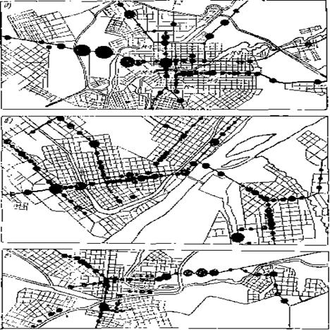 Кроме того, в этих же целях может использоваться и такой графический метод анализа ДТП, как построение картограмм повторяемости наездов на пешеходов (рисунок 5.4) На таких картограммах диаметр кружка пропорционален числу наездов на пешеходов в течение определенного периода времени (например, за три года). За исходное значение показателя повторяемости может быть принято его минимально возможное число — один наезд на пешехода на участке улично-дорожной сети в течение года. Как видно из картограмм, повторяемость этих ДТП имеет достаточно большой диапазон изменения. Для оценки степени изменения количества наездов на пешеходов на различных магистралях предлагается использовать коэффициент размаха