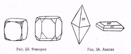 Флюорит CaF2. Кубической сингонии. Кристаллы — кубы, реже октаэдры (рис.53). Обычны двойники прорастания по (111). Спайность совершенная по (111). Излом неровный до раковистого. Хрупкий, Твердость 4. Уд. вес 3,01—3,25. Блеск стеклянный. Окраска разнообразная: фиолетовая, зеленая, голубая, желтая, красная, реже белая и серая. Часто бесцветен до водяно-прозрачного. Обычно неравномерно окрашен в фиолетовый и зеленый цвета. Изотропен. N = 1,434. Вследствие хрупкости и небольшой твердости редко сохраняется в россыпях. При дроблении образует зерна неправильной формы, реже пластинчатые осколки по спайности.