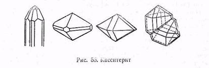Касситерит SnO2. Тетрагональной сингонии. Габитус кристаллов призматический, реже бипирамидальный. Призматические кристаллы удлиненные или короткостолбчатые с преобладающим развитием призматических и подчиненным развитием бипирамидальных граней. Пирамидальные кристаллы чаще тупые, реже остроугольные с вытянутыми вершинками, придающими кристаллам пиковидный облик (рис. 55). Иногда наблюдаются тонко-игольчатые кристаллы. Кроме того, встречаются почковидные формы с радиально-лучистой концентрической структурой. Эта разновидность касситерита называется деревянистым оловом. Призматические кристаллы имеют тонкую вертикальную штриховку. Двойники простые и полисинтетические. Простые двойники, часто коленчатые, срастаются по грани бипирамиды (101). Полисинтетические двойники дают срастание по призме (110). Спайность по (100) несовершенная, по (111) неясная и по (110) едва заметная. Излом неясно-раковистый до неровного. Хрупкий. Твердость 6—7. Уд. вес 6,8—7,1. Блеск алмазный, металловидный или жирный. Окраска различная, иногда пятнистая. Цвет обычно коричневый, бурый до смоляно-черного, реже желтый, серый до бесцветного. Иногда красный и зеленоватый. Темно-окрашенный касситерит нередко содержит примеси железа и тантала. Прозрачен. Порошок коричневатый, светло-бурый, блестящий, просвечивающий под бинокулпром. Оптически одноосный положительный. Высокие показатели преломления: Nm=1,997 и Ng=2,093. Высокое двупреломление. В отраженном свете темно-серый, темнее сфалерита, с высоким рельефом и ямчатой поверхностью от плохой восприимчивости к полировке. Твердость высокая: стальной иглой не чертится, В косом свете дает желтые, коричневые или буроватые внутренние рефлексы. Реактивы не действуют.