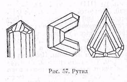 (рис. 57). Вершины кристаллов обычно тупые. Призматические грани часто покрыты грубой штриховкой и ребристостью, параллельной главной оси. Двойники срастания по (101), нередко коленчатые. Тонкое полисинтетическое двойникование по призме. Спайность ясная по (110) и (100). Твердость 6. Уд. вес 4,2. Излом неяснораковистый до неровного. Цвет желтый, коричневый, до буровато-красного и черного. Порошок буровато-желтый или красноватый, реже коричневый и бурый. Под бинокуляром порошок проявляет своеобразный алмазно-металловидный или жирный блеск. В кристаллах или зернах прозрачен до непрозрачного. Под микроскопом в проходящем свете оптически одноосный положительный. Крайне высокие показатели преломления: Nm = 2,616 и Ng = 2,903. Вследствие высокого двупреломления (0,287) рутил при скрещенных николях сохраняет ту же окраску, какую он имеет в проходящем свете (собственная окраска рутила накладывается на высший белый цвет, который должен был бы быть у бесцветного минерала при таком высоком двупреломлении). Иногда плеохроичен. В отраженном свете серовато-белый со слабым сиреневатым оттенком к гладкой полированной поверхностью. В косом свете наблюдаются красные и желтые внутренние рефлексы. Порошок коричневатый или буровато-желтый.