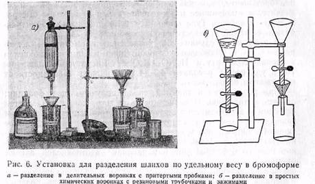 Тяжелую фракцию, чтобы очистить ее от бромоформа, промывают в стаканчике спиртом-ректификатом 2—3 раза и после промывки сушат на электрической печи (или на другом источнике тепла). Легкую фракцию спускают на фильтр в воронку, конец которой погружен в склянку для бромоформа, после чего легкую фракцию к воронку, служившую для разделения, также промывают спиртом.