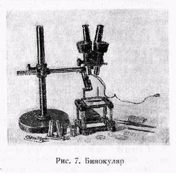 Для получения рудных концентратов также в большинстве' случаев приходится измельчать материал до размеров меньше 1 мм. Поэтому при исследовании шлихов и рудных концентратов необходимо применение бинокуляра с большими увеличениями (рис. 7). Следует отметить также, что под бинокуляром возможно исследовать лишь материал, крупностью не меньше 0,01 мм, так как минеральные частицы меньшего размера трудно извлекать в виде отдельных зерен для определения физических свойств и оптической и химической проверки минералов.