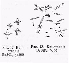 а) Осаждение Ва§О4. Из растворов барий легко осаждается серной кислотой. К капле раствора бария прибавляют каплю серной кислоты и получают обильный тонкокристаллический осадок сернокислого бария, не растворимый - в кислотах (рис. 12).