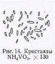 в) Образование кристаллов ванадиевскислого аммония NH4VO3. Минералы сплавляют с перекисью натрия Na2O2 на платиновой проволоке, а затем сплав выщелачивают водой на часовом стекле и отфильтровывают по методу Геммеса. К раствору прибавляют твердый NН4С1, после чего выпадают кристаллы метаванадата аммония в виде чечевицы с сильным двупреломлением и косым угасанием (рис. 14).