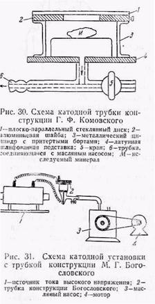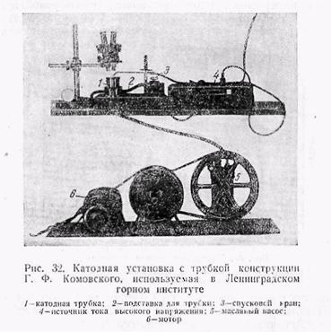 Аппарат для катодной люминесценции состоит из катодной трубки, высоковольтного трансформатора, подающего высокое напряжение на электроды катодной трубки, и вакуумного насоса с мотором. Изучаемый объект (шлих, фракция или отдельные зерна) помещается в катодную трубку и облучается там катодными лучами, образующимися в результате излучения электронов одним из электродов катодной трубки, при высоком разрежении, получаемом с помощью вакуумного насоса. Скорость электронов зависит от степени разрежения воздуха внутри трубки. С увеличением вакуума усиливается катодное излучение.