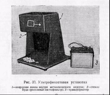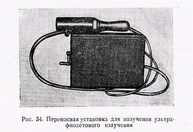 Прибором для получения ультрафиолетовых лучей служит ртутная кварцевая лампа (рис. 33). Она помещается в металлический кожух с окошком 2, в котором вставлено черное стекло Вуда. Для усиления действия ультрафиолетовых лучей на исследуемые минералы на пути лучей устанавливается двояковыпуклая кварцевая линза. Ртутная кварцевая лампа дает излучение с длиной волны порядка 6000—2300 А. Наряду с ртутными кварцевыми лампами для получения ультрафиолетовых лучей используются кварцевые лампы, изготовляемые для медицинских целей. Они также помещаются в металлическом кожухе с окошечком, в которое вставлено стекло Вуда для поглощения лучей видимого света. Медицинская кварцевая лампа, например типа АРК-4, питается через трансформатор 5 от осветительной сети с напряжением 110—120 в. На лампе создается напряжение около 70 в при силе тока 4 а, существует переносная установка для получения ультрафиолетового излучения (рис. 34). Эта установка питается от источника тока высокого напряжения. В качестве такого источника используется магнето