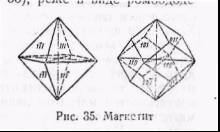 Магнетит FeFe2O4. Кубической сингонии. Большей частью наблюдается в виде октаэдров (рис. 35), реже в виде ромбододекаэдров со штриховкой на гранях, параллельной длинной диагонали ромба. В виде куба кристаллы магнетита встречаются исключительно редко. Двойники по октаэдру. Иногда наблюдаются полисинтетические двойники, которые дают штриховку на гранях октаэдра и часто ложную спайность. Излом неяснораковистый до неровного. Хрупкий. Твердость 5,5 -6,5. Уд. вес 5,2. Блеск сильный металлический до матового полуметаллического. Цвет железно-черный. Порошок черный, у окисленного магнетита буровато-черный. Сильно магнитен. Непрозрачен.