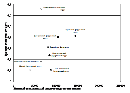Рис.2. Расположение федеральных округов Российской федерации по уровню инновационности и экономическому показателю