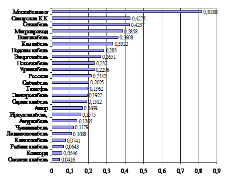 16 | Сарансккабель» | 0,2542 | 0,1003 | 0,3862 | 0,1043 | 0,6233 | 0,0 | 0,0323 | 0,0105 |