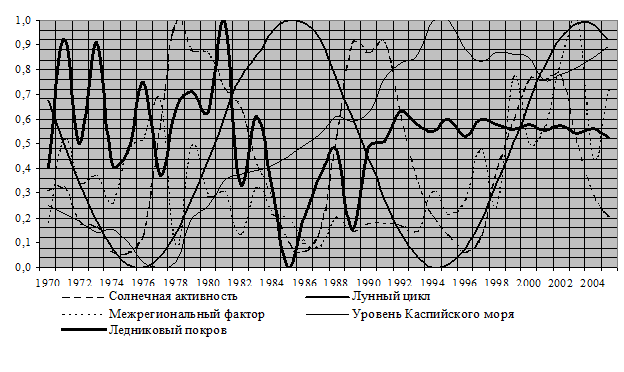 На графиках, приведенных на рис. 1, наблюдается коррелированность солнечной активности и ледникового покрова, лунного цикла и уровня Каспийского моря.