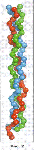Коллаген (рис. 2) является самым важным белком в организме, так как составляет 30% массы белка человека и 70% массы белков кожи. В настоящее время описано 19 типов коллагена, наиболее важными из них являются первые пять. Коллагеновые волокна - гибкие и прочные, но не эластичные. В сочетании с волокнами белка эластина, которые наряду с гибкостью отличаются также эластичностью, они играют роль каркаса дермы и «совместными усилиями» придают коже упругость.