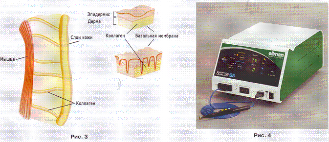 RF-технологии - новый метод неинвазивной стимуляции неоколлаганеза в дерме и соединительно-тканных волокнах гиподермы. Современный термин «RF-Radio Fregmency» может относиться к разным типам устройств (моно-, би - и триполярные), генерирующих излучение с разными характеристиками, которое оказывает разное действие на биологические ткани. Однако принцип метода одинаков и основан на контактном воздействии высокочастотного электромагнитного поля с целью контролируемого прогрева дермы и подкожно-жировой клетчатки (рис.1). Эпидермис при этом играет роль конденсатора и нагревается только за счет контактного теплообмена с дермой, а мышечная ткань не нагревается совсем. Под воздействием тепла происходит изменение существующих коллагеновых волокон, как результат реструктуризации дермы с частичной усадкой (ретракцией) коллагена, а также образование новых коллагеновых фибрилл.