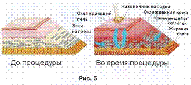 Температура порядка 60-65°С вызывает повреждения, достаточные для провоцирования контролируемой воспалительной реакции, при этом в дерме и подкожно-жировой клетчатке происходит реконструкция коллагена, вызывающая поверхностную подтяжку кожи.