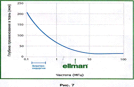 Термические характеристики взаимодействия радиоволновой энергии с тканями определяются типом ткани, формой волны и частотой (рис 7);