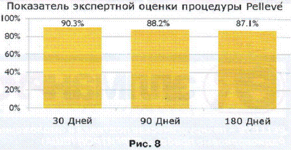 Экспертная оценка определяется, как средний коэффициент 3 экспертов, показывающий улучшение более 25% в отношении глубины и количества морщин и улучшение упругости кожи (рис 8).
