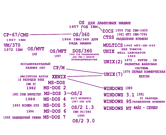 Операционная система (ОС) – системная программа, обеспечивающая управление всеми устройствами ЭВМ (процессор, память, диски и т. д.), а также реализующая интерфейс с пользователем. Первая ОС (operating system) появилась в 1957 г. Структурограмма развития ОС показана на рис. 1.