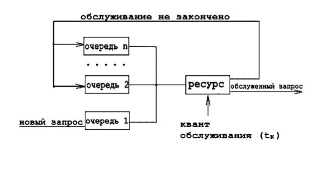 Используется для организации режима разделения времени. В такой дисциплине короткие запросы обслуживаются быстрее, то есть имеют меньшее среднее время ожидания в системе, чем длинные запросы. Степень благоприятствования коротким запросам тем больше, чем меньше длительность кванта мультиплексирования, чем ближе она к длительности интервала номинального использования ресурса процессом. Однако уменьшение длительности кванта ведет к увеличению накладных расходов, необходимых для обработки прерываний и перераспределения ресурса. Возрастание частоты прерываний может неблагоприятно сказаться на обработке длинных запросов.