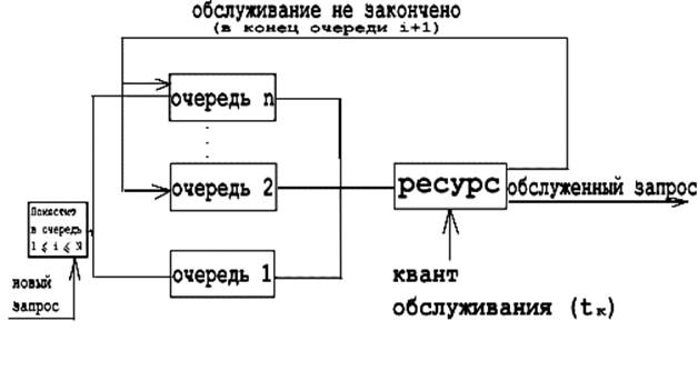 После обслуживания из очереди i система выбирает для обслуживания запрос из непустой очереди с самым младшим номером. Таким запросом может быть следующий запрос из очереди i или из очереди i+1 (при условии, что после обслуживания запроса из очереди i последняя оказалась пустой). Новый запрос поступает в первую очередь (i=1). В такой ситуации после окончания времени tk, выделенного для обслуживания запроса из очереди i, будет начато обслуживание запроса первой очереди. Если система выходит на обслуживание заявок из очереди N, то они обслуживаются либо по дисциплине FIFO (каждая заявка обслуживается до конца), либо по циклическому алгоритму. Данная система наиболее быстро обслуживает все короткие по времени обслуживания запросы. Недостаток системы заключается в затратах времени на перемещение запросов из одной очереди в другую.
