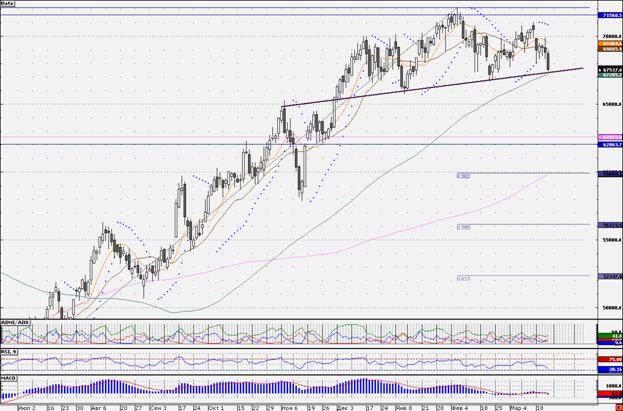 Накануне привилегированные акции «Транснефти» не удержали 21-дневной скользящей средней руб.). Сегодня бумаги продолжают откат вниз от данного уровня. На дневном графике акций происходит формирование масштабной фигуры «голова и плечи» с восходящей линией «шеи» в районеруб. Появление данной фигуры является неплохим «медвежьим» сигналом. Кроме того, показания трендовых индикаторов не исключают вероятности развития негативного сценария. Индикатор ADMI/ADX показывает, что преимущество пока на стороне продавцов (линия «медведей» находится выше линии «быков»), при этом сигнальная линия MACD(12;26;9) сверху вниз пересекается с нулевой линией. Таким образом, целью для снижения акций выступает линия «шеи», которая сегодня располагается на отметкеруб., чуть ниже данной отметки проходит 100-дневная скользящая средняя. Закрепление акций ниже линии «шеи» может усилить распродажи. Однако неопределенность на торговых площадках может нарушить «медвежьи» планы, в связи с чем при приближении к линии «шеи» «шорты» стоит сокращать. Наш 30-минутный торговый робот находится в «шортах», удерживая короткие позиции от отметки 68 831 руб.