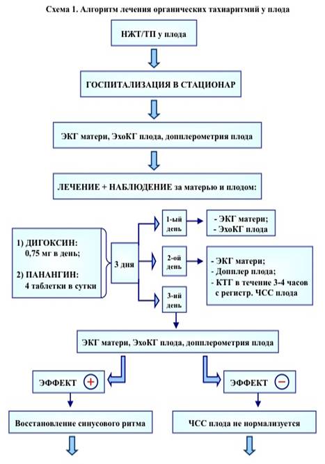 При выявлении органической формы тахиаритмии у плода показана госпитализация беременной в стационар. Предполагаемая терапия любым антиаритмическим препаратом требует обязательного предварительного обследования матери. Необходимый минимум исследований включает ЭКГ и ЭХО-КГ женщины. Стандартная дозировка дигоксина составляет 3 таблетки в сутки (по 1 таблетке каждые 8 часов) с одновременным назначением препаратов калия. В течение 3-х дней насыщения ежедневно проводится ЭКГ матери. В 1-ые сутки лечения выполняется ЭХО-КГ плода, на 2-ой день помимо ЭХО-КГ осуществляется также доплерометрия плода и КТГ с регистрацией фетальной ЧСС в течение 3-4 часов. Задачей пациентки в период регистрации КТГ является фиксация нормальных показателей ЧСС плода: продолжительности и регулярности появления эпизодов синусового ритма. С учетом того, что ЧСС свыше 200 уд/мин аппарат не регистрирует,