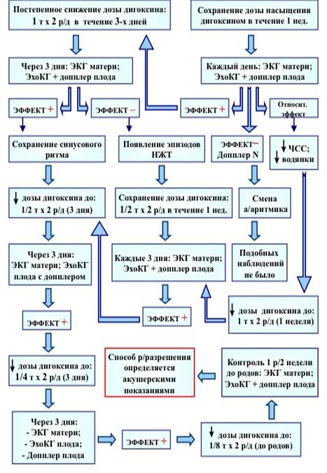 3) По достижении дозы дигоксина 1/8 таблетки и сохранении эффекта через 2 недели по данным контрольного исследования плода, возможна отмена препарата с последующим контролем сохранения эффекта. Контрольные обследования проводятся каждые 2 недели вплоть до родов. В случае сохраняющегося синусового ритма и нормальных показателей ФПК способ родоразрешения определяется акушерскими показаниями. При рецидиве аритмии (спустя 2 недели после отмены минимальной дозы дигоксина) необходимо назначение предыдущей дозы препарата с его приемом до родов. Если назначение предыдущей дозы препарата оказывается неэффективным (по истечении 3-х дней), показано полноценное повторное насыщение согласно схеме 3.
