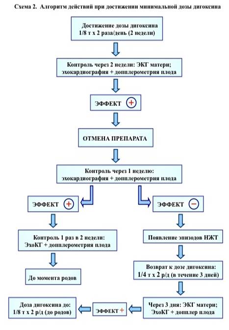В случае отсутствия эффекта от 3-х дневного приема дигоксина, дозу насыщения необходимо поддерживать еще в течение 4-х дней (то есть процесс насыщения продолжается в течение 1 недели). В этом случае ежедневно осуществляется ЭКГ матери и обследование плода (ЭХО-КГ, доплерометрия, КТГ). При нормализации ритма начинается постепенное