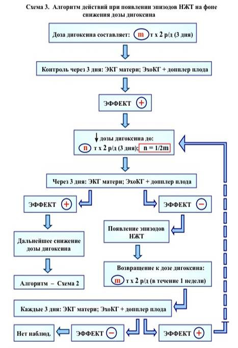 2) При восстановлении синусового ритма и снижении дозы дигоксина ЭКГ матери, ЭхоКГ и допплерометрию плода необходимо проводить каждые 3 дня (схема 2);