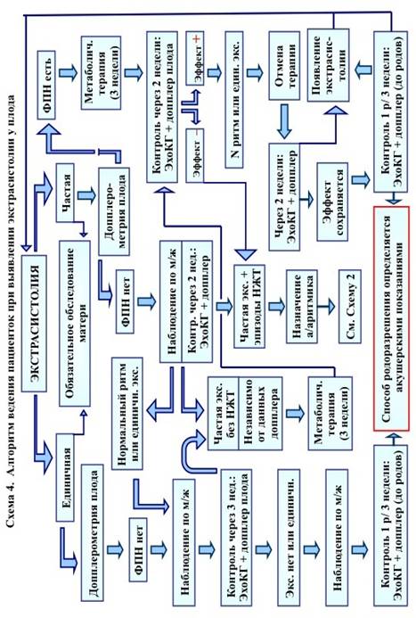 Представленный ниже алгоритм (схема 1-3), по нашему мнению, является удобным в практическом использовании, поскольку охватывает собой весь спектр возможных клинических ситуаций при попытке лечения НЖТ (ТП) у плода и может служить четким стандартизованным руководством специалисту при ведении беременных с органическими формами тахиаритмий у плода. При любом варианте развития событий указан необходимый и достаточный объем клинико-диагностических мероприятий: выбор адекватной дозы антиаритмика, длительность применения данной дозировки препарата, частота, сроки и необходимый объем контрольных исследований матери и плода.