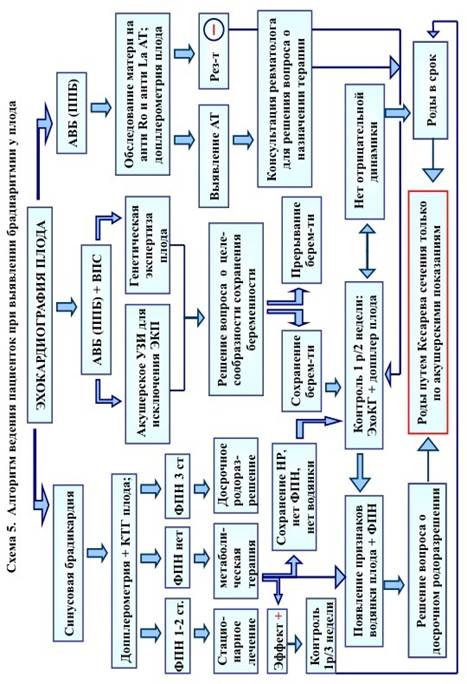 5. При выявлении жизнеугрожающих форм нарушений сердечного ритма и проводимости у плода (наджелудочковая тахикардия, экстрасистолия с пробежками наджелудочковой тахикардии, полная поперечная блокада) обязательным является проведение перинатального консилиума для решения вопроса о возможности и способах лечения, пролонгации беременности, способе и сроках родоразрешения.