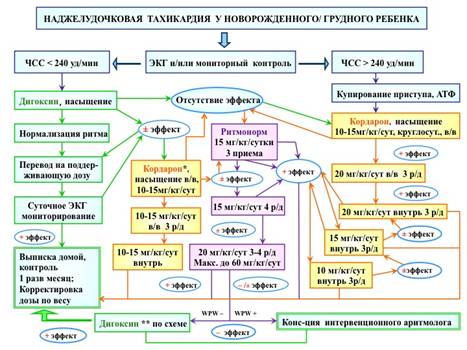 7. Препаратом выбора в лечение фетальной наджелудочковой тахикардии является дигоксин, способ введения и сроки применения которого определяются предложенным алгоритмом лечения. Препаратами выбора в лечении неонатальной наджелудочковой тахикардии являются кордарон, пропанорм и дигоксин. Отмена антиаритмических препаратов после 6-9 месяцев жизни не приводит к рецидиву аритмии.