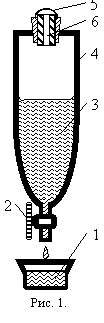 Экспериментальная установка (рис.1) состоит из стеклянного сосуда 4, который с помощью хомутиков крепится на штативе. Сверху сосуд закрыт резиновой пробкой 7 с вмонтированным в нее капилляром 6. Для предохранения капилляра от загрязнения на пробке установлен стеклянный колпачок 5. Вода 3 вытекает через штуцер с краном 2 в стакан 1.
