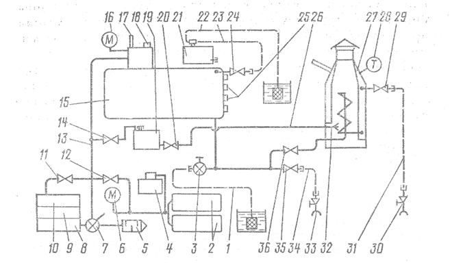 Для этого в форсунку 32, установленную в топке, из бачка с топливом 19 подают топливо под давлением 0,1...0,15 МПа, открыв вентили 14 и 20. В испарителе форсунки 32 топливо испаряется и при выходе сгорает в топке. Дымовые газы