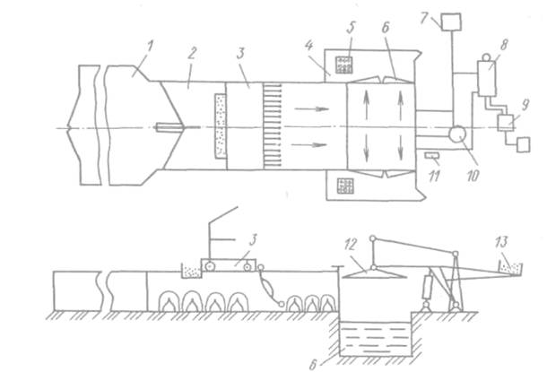1-приемный загон; 2-предкупочный загон; 3-толкающая тележка; 4-отстойный загон; 5-отстойник; 6-ванна; 7-насосная станция; 8-котел-парообразователь; 9-отопительная система; 10-смеситель; 11-место оператора; 12-окунатель; 13-противовес
