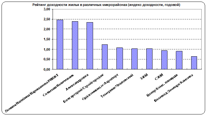 Как показывает таблица 2, за год – в сравнении с февралем 2013 года - номинальные цены выросли на 1,14%, а реальные (скорректированные на инфляцию) – на 1,07%. Таким образом, можно заключить, что рост цен вызван и ростом инфляции, и иными рыночными факторами. График 21 показывает, что в феврале район Ленина/Нагибина/Нариманова/РИИЖТ стал лидером по доходности, что объясняется наиболее значительным годовым приростом средней цены предложения на продажу.